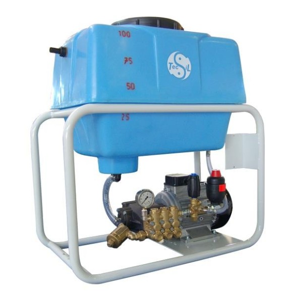Grupo Motor Bomba de agua fría con depósito de agua de 110 lts para alta presión con bomba Interpump de bielas y culata de latón. Idóneo para trabajos contínuos profesionales de limpieza a gran escala.